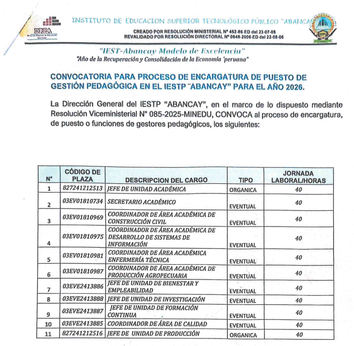 Convocatoria para proceso de encargatura de puesto de gestión pedagógica en el IESTP “Abancay” para el año 2026.